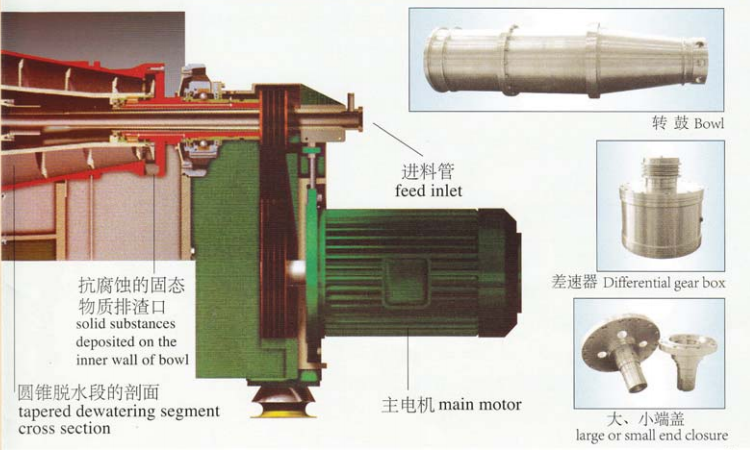 該機轉(zhuǎn)鼓由主電機帶動,變頻輔電機和齒輪箱(或液壓馬達)構(gòu)成轉(zhuǎn)鼓和螺旋之間差速系統(tǒng),轉(zhuǎn)鼓和螺旋在同一軸線以不同轉(zhuǎn)速同向旋轉(zhuǎn),懸浮液通過固定的進料管,經(jīng)螺旋出料口進入轉(zhuǎn)鼓,在高速旋轉(zhuǎn)的離心力作用下,比重較大的固相顆粒沉降到轉(zhuǎn)鼓內(nèi)壁,在螺旋差速的作用下,不斷將沉降在轉(zhuǎn)鼓內(nèi)壁上的固相顆粒刮下并推向轉(zhuǎn)鼓小端,從排渣口排出,比重較小的液相在轉(zhuǎn)鼓內(nèi)形成內(nèi)層液環(huán),沿螺旋槽不斷被澄清流向轉(zhuǎn)鼓大端,從口徑可調(diào)的溢流堰板口溢出,從而實現(xiàn)了固液二相或三相分離。轉(zhuǎn)鼓轉(zhuǎn)速、轉(zhuǎn)鼓和螺旋之間的差速,根據(jù)分離物料特性進行無級可調(diào)。